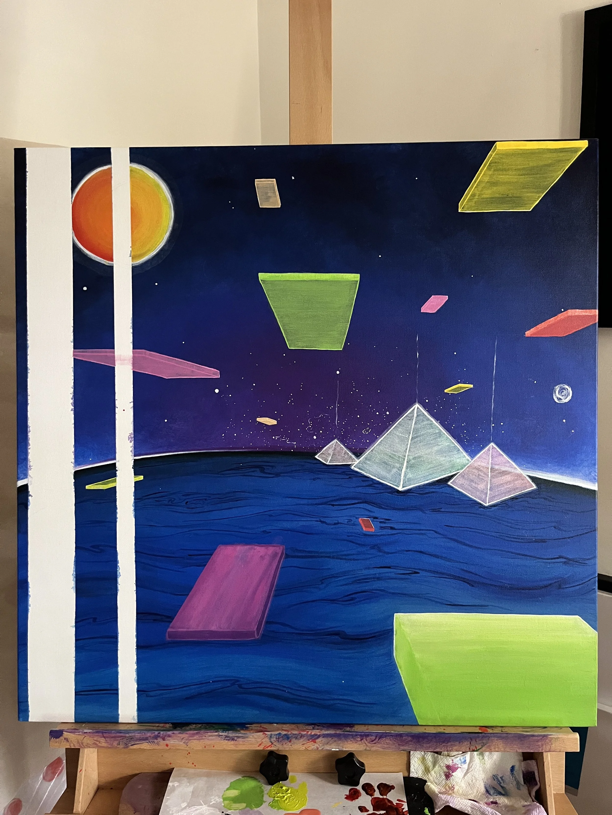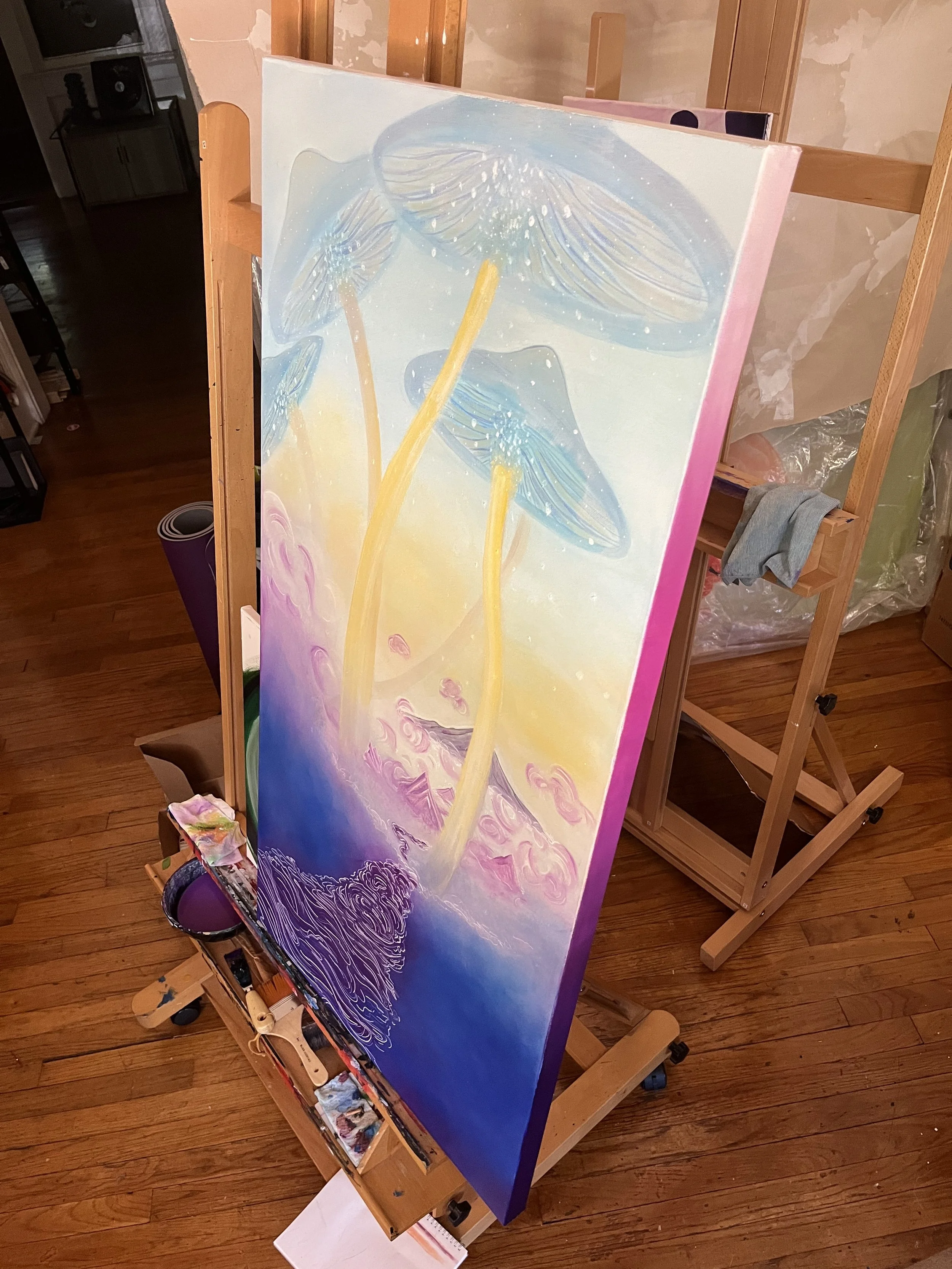 It’s also exciting to be making art while I’m busy. This used to be impossible in the midst of my decade of depression. I’ve been finishing up two paintings (one is now complete) and have ideas/materials for a fresh one (a new color vision experienced during yoga).